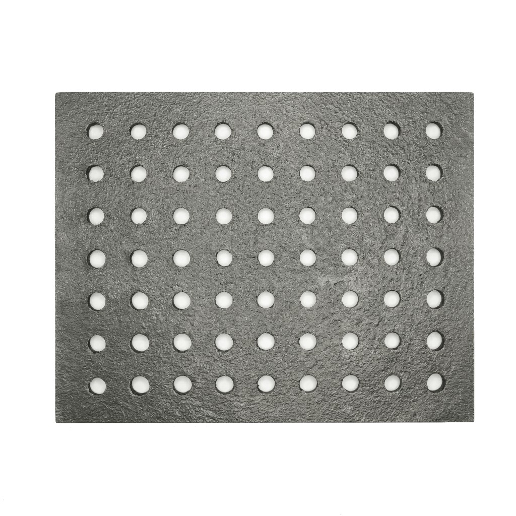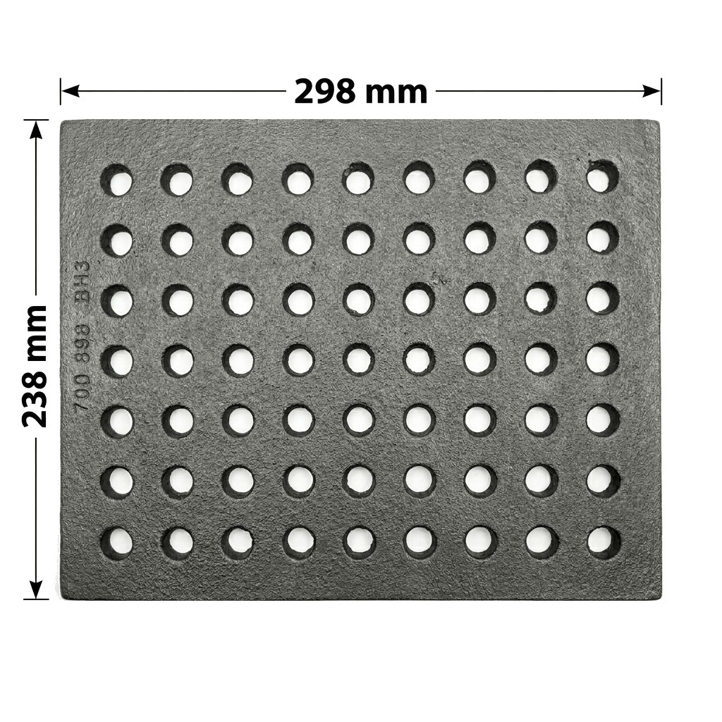 Ruszt żeliwny zespolony 23,8x29,8 cm to część wymienna popularnych żeliwnych francuskich wkładów kominkowych Uniflam. Ruszt żeliwny 298 mm x 238 mm ważący ok. 4,5 kg, odlewany z żeliwa szarego, produkt o trwałym i solidnym wykonaniu.