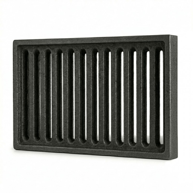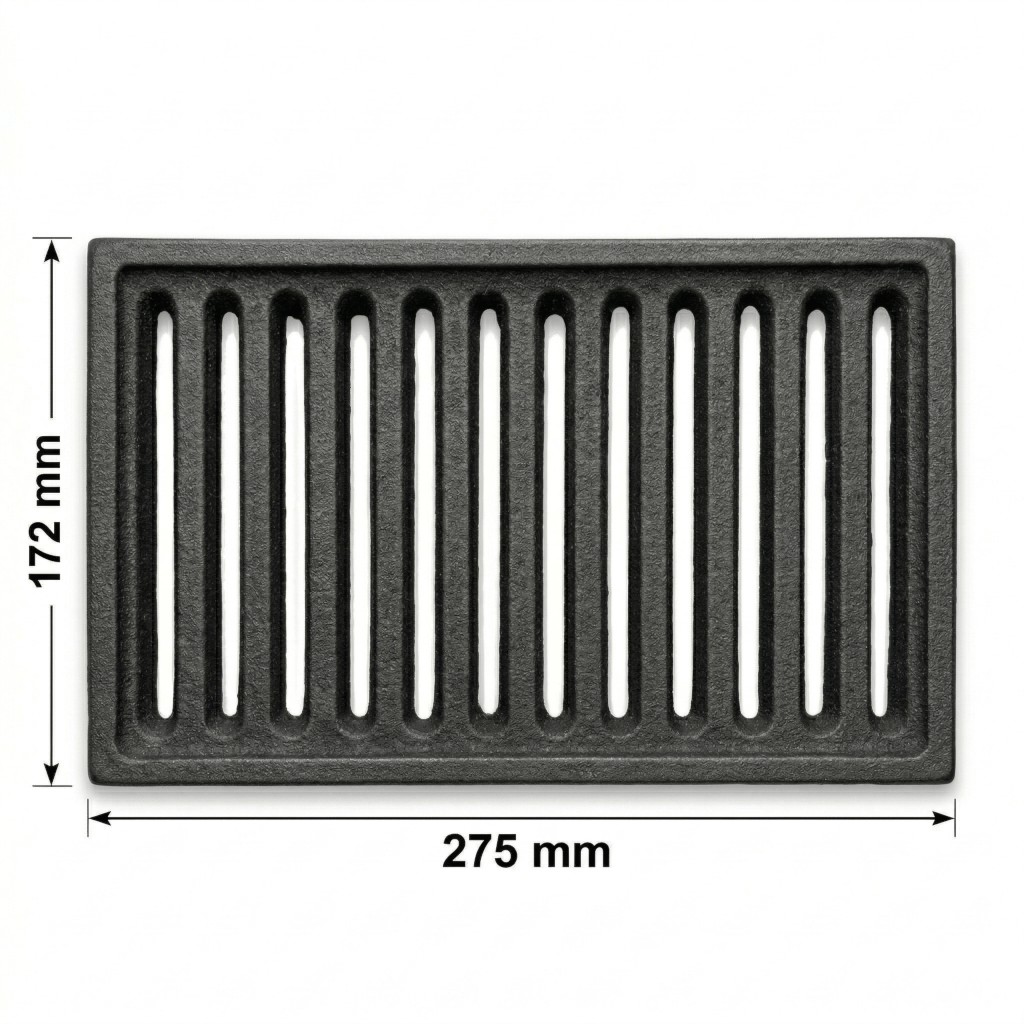 Ruszt żeliwny zespolony 17,2x27,5 cm to część wymienna popularnych stalowych polskich wkładów kominkowych CTM. Ruszt żeliwny 275 mm x 172 mm ważący ok. 3,9 kg, odlewany z żeliwa szarego, produkt o trwałym i solidnym wykonaniu.