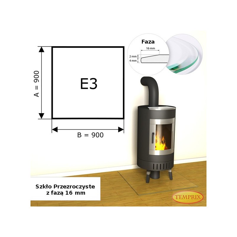 Podstawa kominkowa z fazą ze szkła przezroczystego E3 o wymiarach 900x900 mm to podstawa wykonana z bardzo odpornego na zarysowania bezpiecznego szkła hartowanego wysokiej jakości o grubości 6 mm. Nasze podstawy cechuje estetyczne wykonanie oraz duża wytrzymałość, nawet do 650 kg.