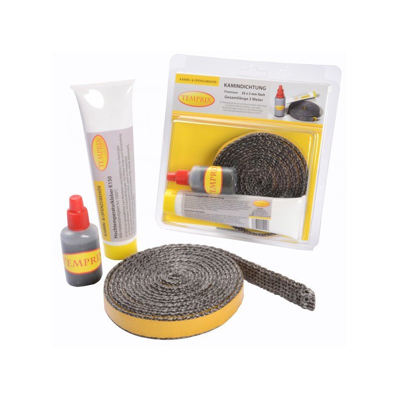 Na prezentowany zestaw naprawczy marki Temprix służący do uszczelniania szyby kominkowej składa się uszczelka kominkowa płaska 25 x 3,5 mm o całkowitej długości 3 metrów oraz 2 kleje wysokotemperaturowe.