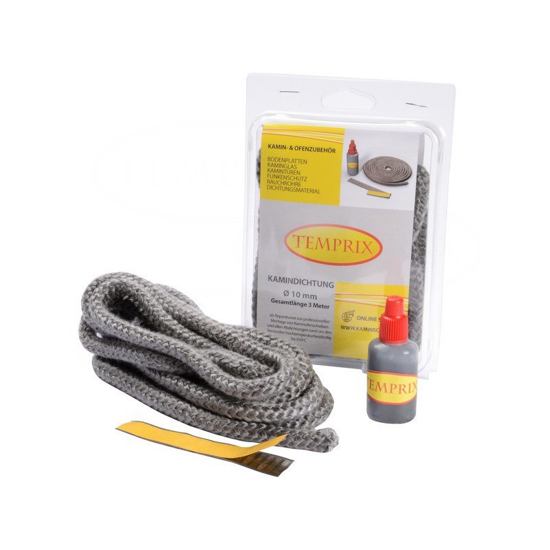 Na prezentowany zestaw naprawczy marki Temprix służący do uszczelniania szyby kominkowej składa się sznur uszczelniający wysokotemperaturowy Ø 10 mm o całkowitej długości 3 metrów oraz klej wysokotemperaturowy.