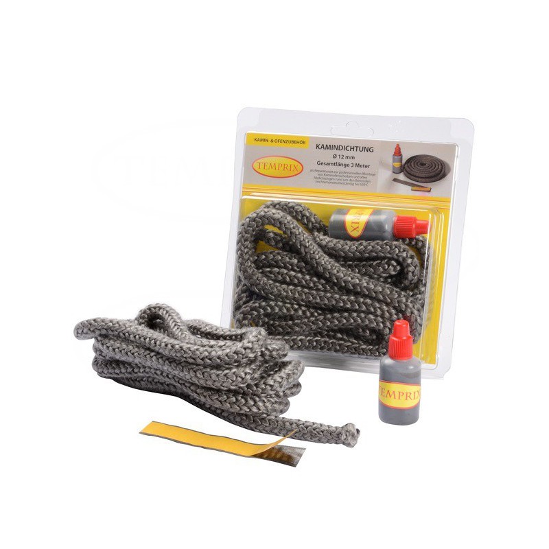 Na prezentowany zestaw naprawczy marki Temprix służący do uszczelniania szyby kominkowej składa się sznur uszczelniający wysokotemperaturowy Ø 12 mm o całkowitej długości 3 metrów oraz klej wysokotemperaturowy.