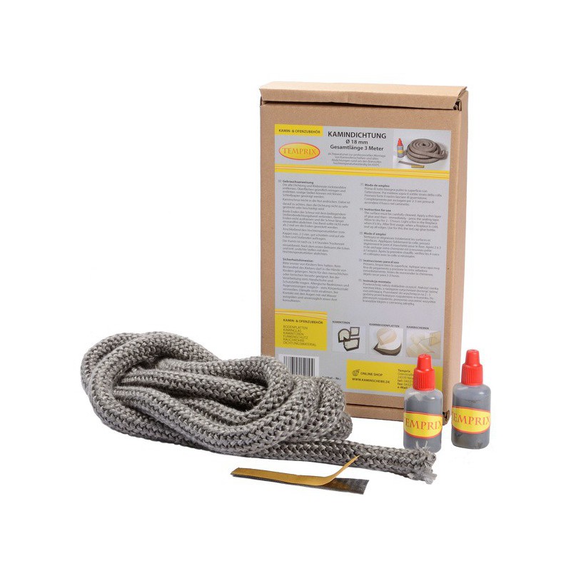 Na prezentowany zestaw naprawczy marki Temprix służący do uszczelniania szyby kominkowej składa się sznur uszczelniający wysokotemperaturowy Ø 18 mm o całkowitej długości 3 metrów oraz klej wysokotemperaturowy.