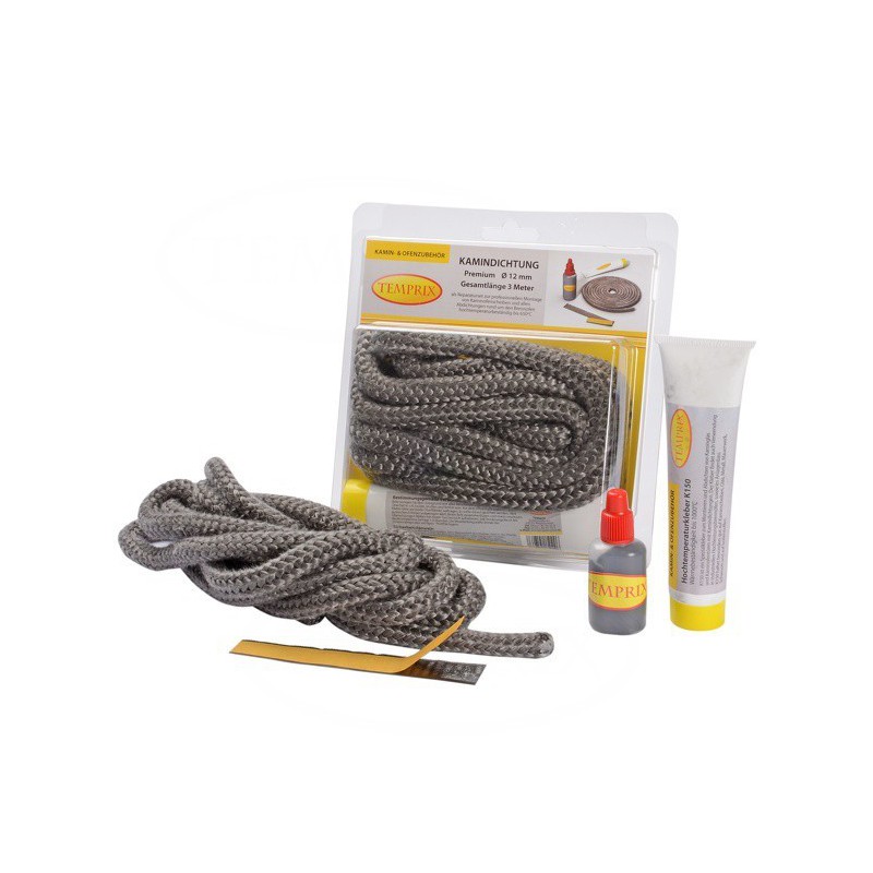 Na prezentowany zestaw naprawczy marki Temprix służący do uszczelniania szyby kominkowej składa się sznur uszczelniający wysokotemperaturowy Ø 12 mm o całkowitej długości 3 metrów oraz 2 kleje wysokotemperaturowe.