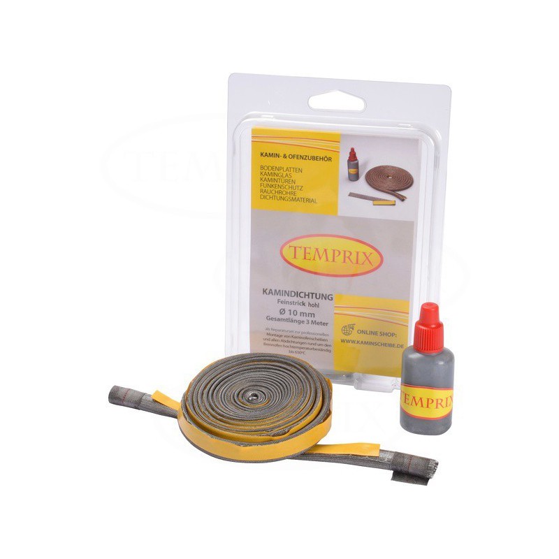 Na prezentowany zestaw naprawczy marki Temprix służący do uszczelniania szyby kominkowej składa się sznur uszczelniający wysokotemperaturowy wydrążony Ø 10 mm o całkowitej długości 3 metrów oraz specjalny klej wysokotemperaturowy.